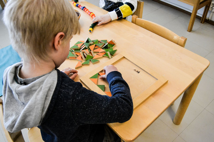 Aamupäivällä työskentelemme montessorivälineistöllä luokassa. Viikoittain pidämme ohjattuja tuokioita, jotka liittyvät esimerkiksi meneillään olevaan projektiin, kuvataiteeseen, musiikkiin tai liikuntaan.